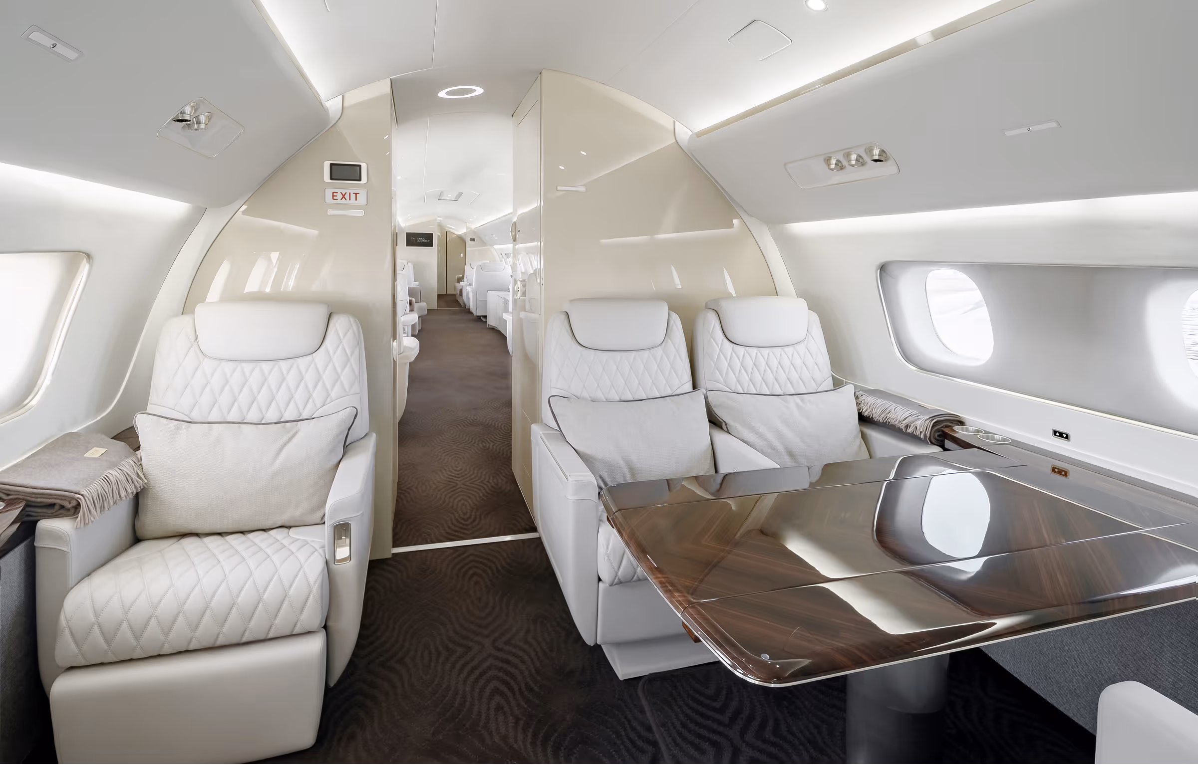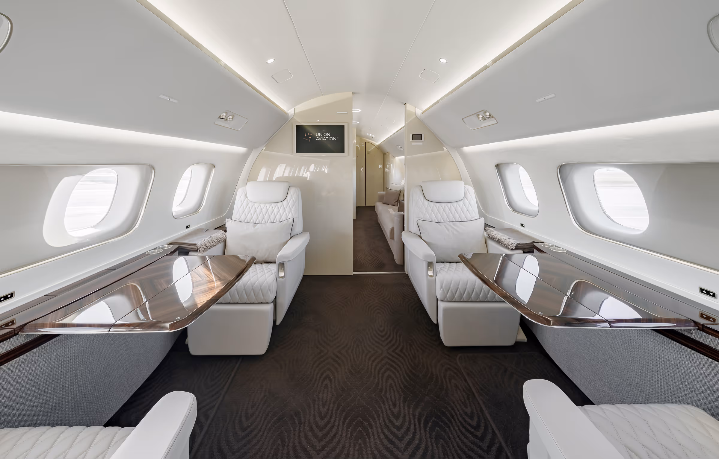 Lidmašīnā ir atpūtas telpa un birojs ar garu dīvānu, vienvietīgi klubkrēsli un bufete ar 32 collu LCD ekrānu.